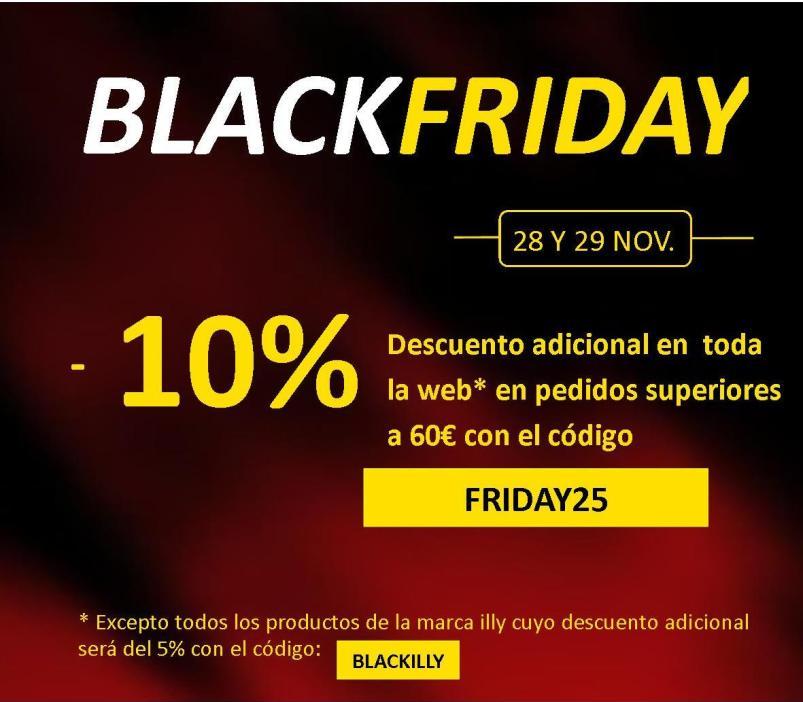 ![]() Llega el BlackFriday a Latiendadelcafe.es con un 10% de Descuento adicional en toda la web* para pedidos de importe superior a 60€ con el código FRIDAY25 * Excepto en todos los productos de la marca illy (cápsulas Iperespresso, compatibles nespresso y monodosis de café ESE) cuyo descuento adicional será del 5% con el código BLACKILLY |
